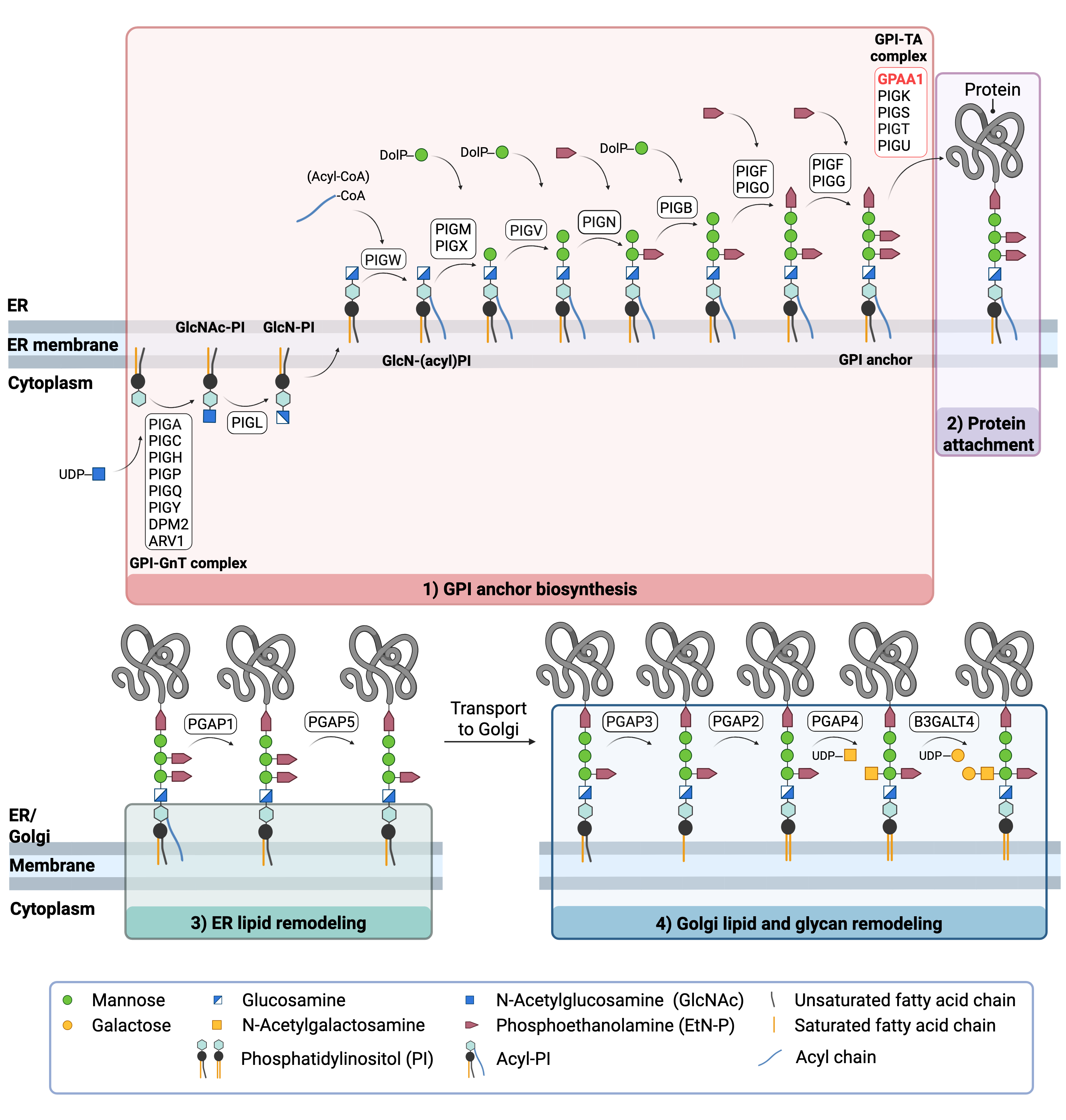 GPI-anchored protein biosynthesis involves a series of enzymatic reactions. Beginning on the cytoplasmic side of the ER, the GPI anchor is synthesized in a stepwise process and then attached to target proteins. GPAA1 facilitates attachment of the GPI anchor to the protein by catalyzing the formation of a peptide bond between the EtN-P group of the GPI and the C-terminal of the protein. After protein attachment, the glycan and lipid components of the GPI anchor undergo further modifications in the ER and Golgi, before the mature GPI-AP is transported to the cell surface.